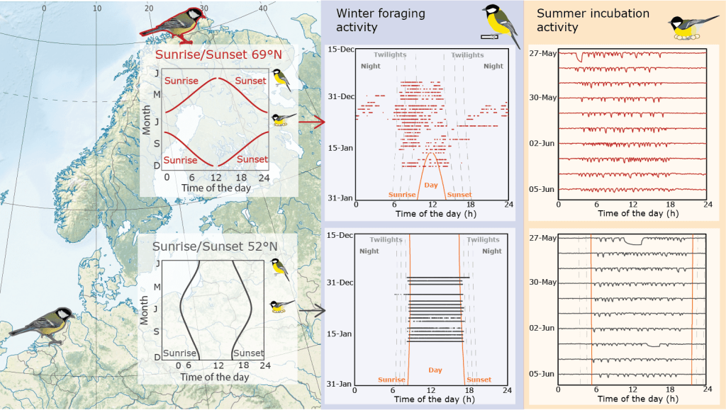 In EvoLight, we focus on the recent (~80 years) expansion of the songbird great tit (Parus major) into the Arctic as a natural experiment to understand how fast animal populations adapt when their range shifts into areas with a novel light environment.